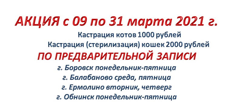 АКЦИЯ с 09 по 31 марта 2021 г. Кастрация котов и (стерилизация) кошек со скидкой.