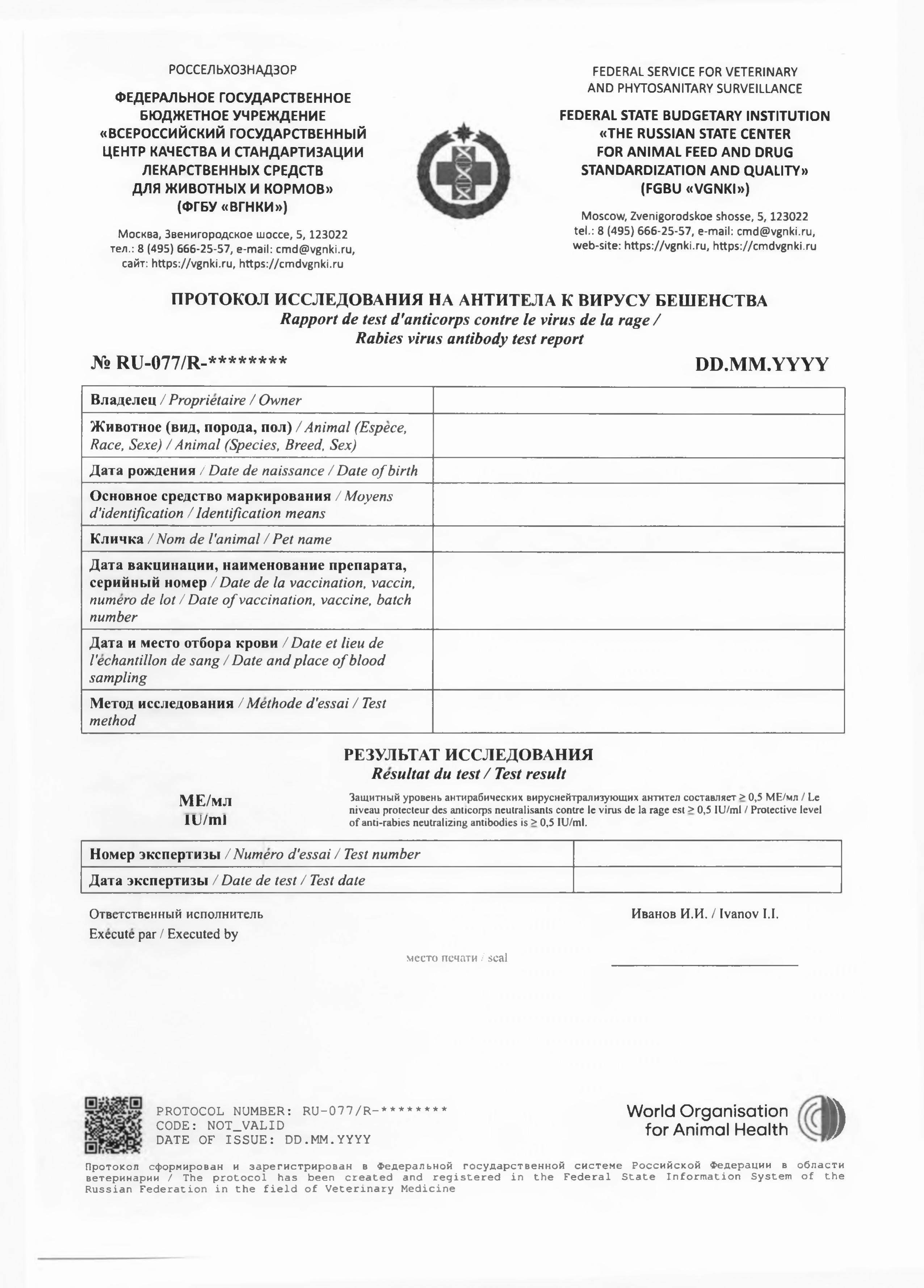 Согласно информации Россельхознадзора с 1 декабря 2025 года ФГБУ «ВГНКИ» и ФГБУ «ВНИИЗЖ» переходят на электронный формат оформления протоколов исследований на титры антител к вирусу бешенства . Данные протоколы необходимы для вывоза собак, кошек и хорьков. Образцы протоколов представлены ниже.